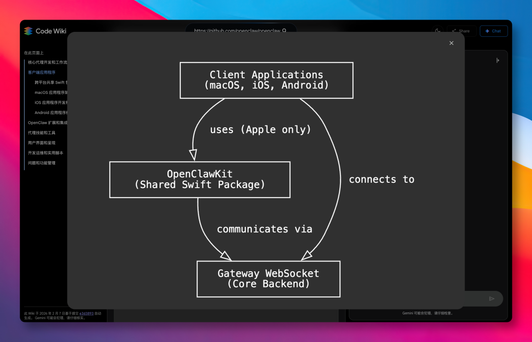 设置好 GitHub 项目后,它便直接生成一张 OpenClaw 整个系统的全景架构图。