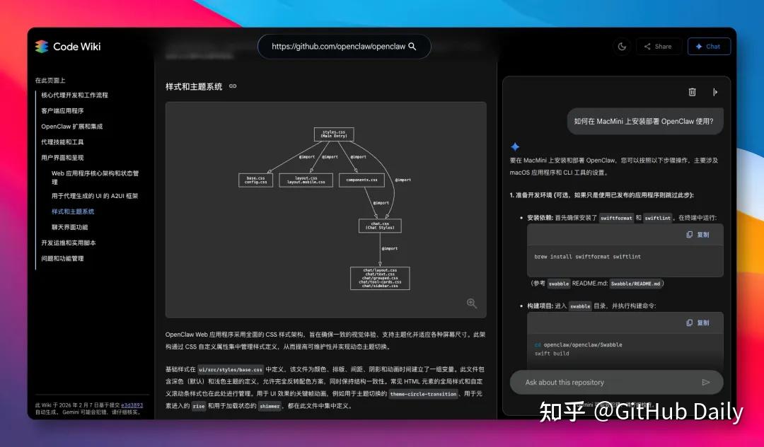 比如我问:“如何在 MacMini 上安装部署 OpenClaw 使用”,详细的步骤便呼之即来。还附带了对应的代码引用来源,不会虚构: